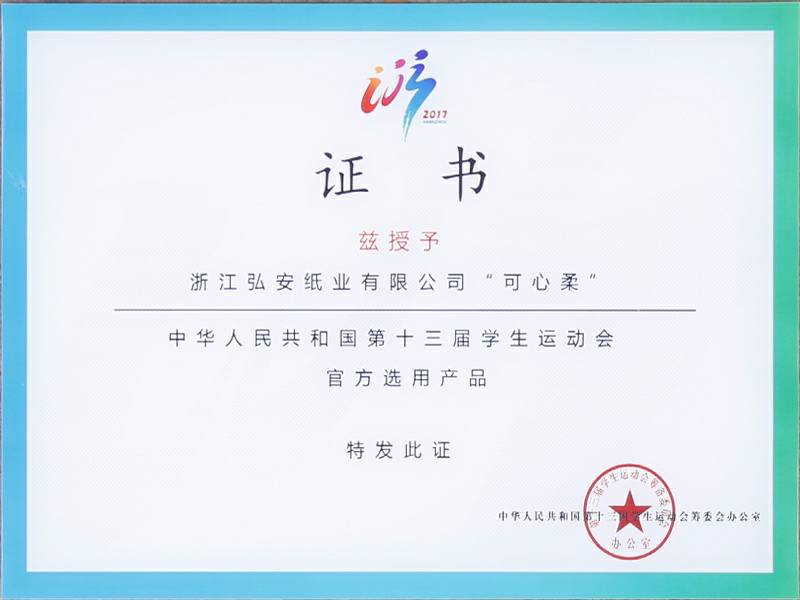2017年9月4日中华人民共和国第十三届学生运动会在浙江杭州举行,可心柔携手中国邮政、中国平安、娃哈哈、京东校园、吉利汽车等知名企业品牌亮相大会。作为本次大会的12家合作单位之一,浙江半岛·官方端网页版登录入口-半岛(中国)纸业有限公司参加了发布会,并接受了官方选用产品的授牌。